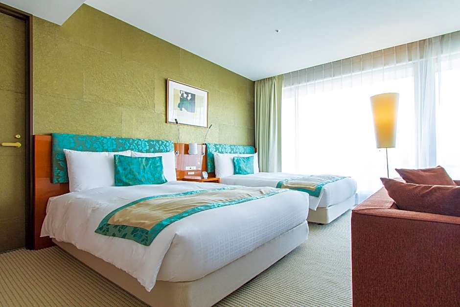 Experience the breathtaking beauty of Mount Fuji from the comfort of your spacious Twin Room. Indulge in the luxury of private amenities including a bathtub and flat-screen TV, while enjoying the tranquility of soundproof walls and extra long beds. No smoking allowed.